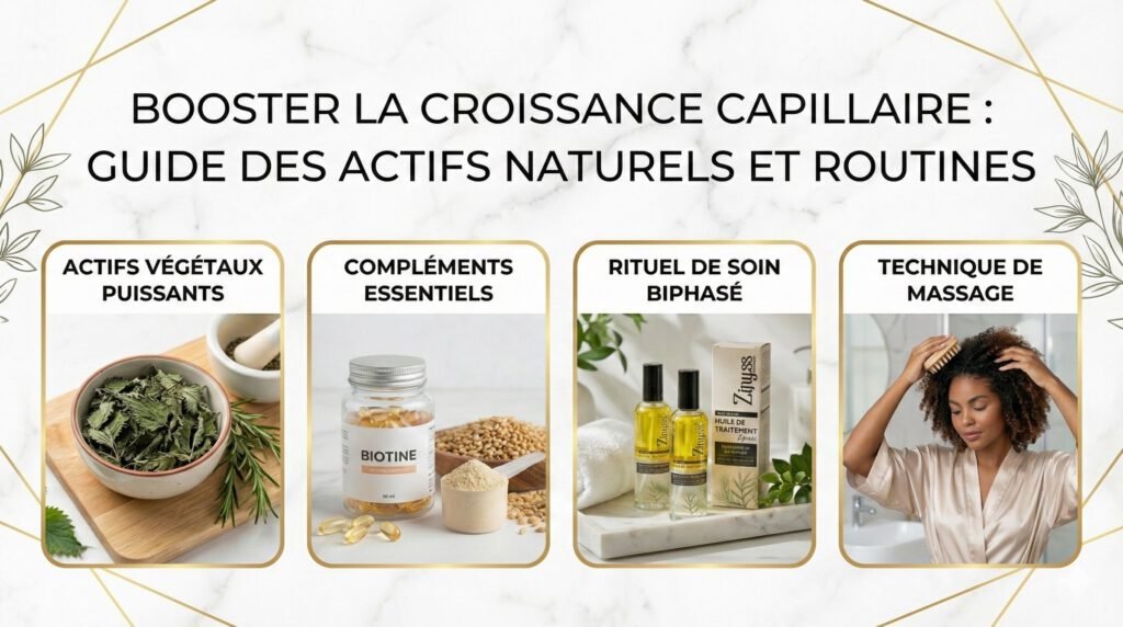 Mots-clés SEO : actifs naturels pousse cheveux, Procapil, biotine cheveux, huile de ricin, cuir chevelu sain, accélérer pousse cheveux, soins naturels capillaires.